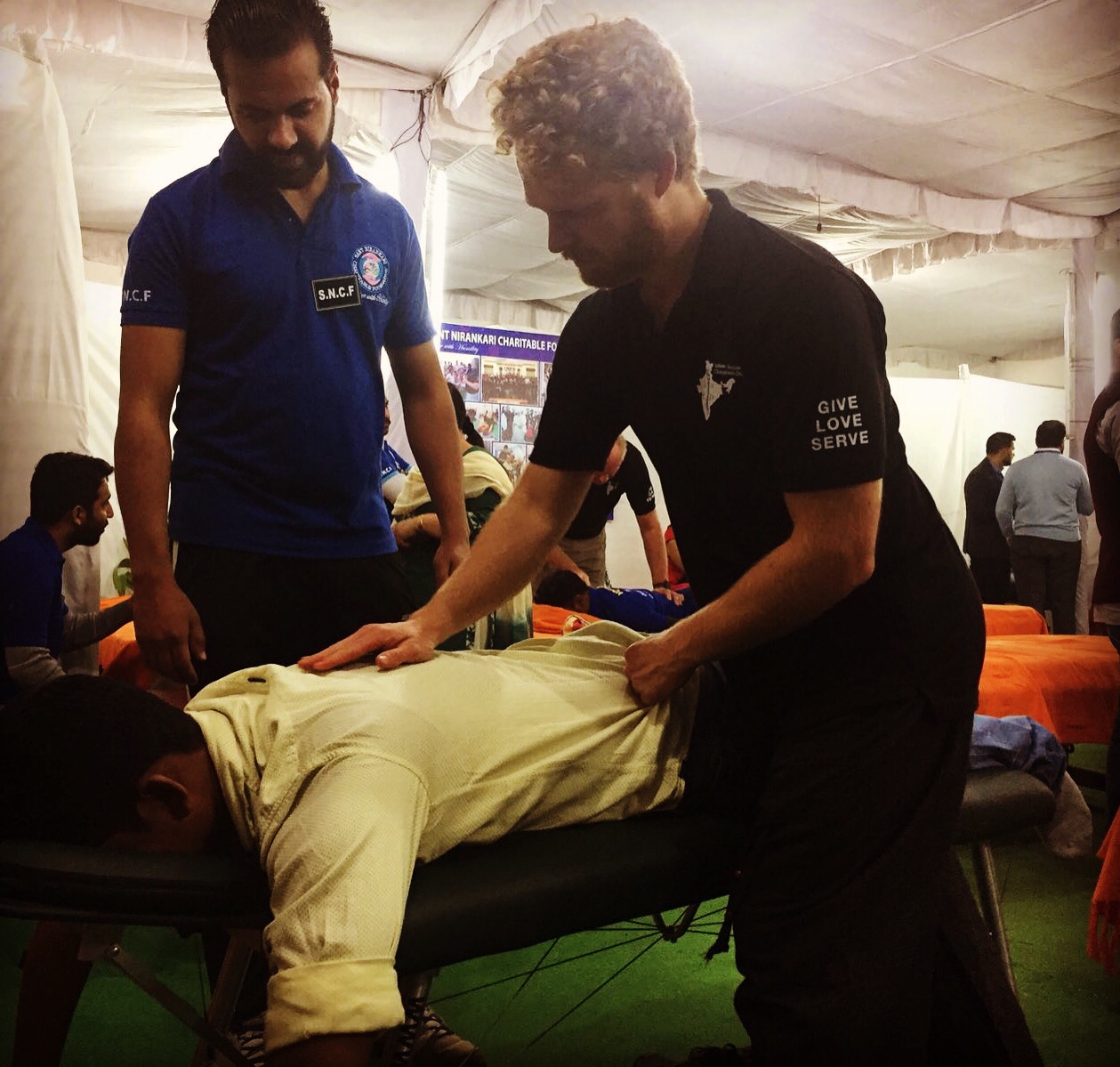 We began the morning by standing in a large circle in the chiropractic tent with about thirty other chiropractors, as well as translators and other staff, holding hands and holding space for one another to set our intentions for the day. This was followed by a large amount of people from all over India swarming into the tent, the vast majority of them coming in for their very first chiropractic visit.