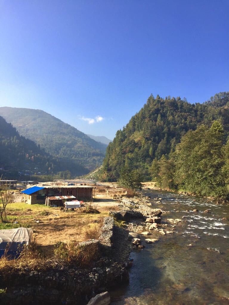 The shower was a gas powered unit that hung on the wall that blasted piping hot water through a handheld shower head that had the teeniest amount of water pressure, slightly more than a dribble, and of course, cost about $2 per use. This would be typical of a place to rest our weary bodies for the next few weeks. We crawled into our extensively warm sleeping bags and fell asleep with the sound of a rushing river right outside our small window. This was the first peaceful rest we’d had since arriving in Nepal.