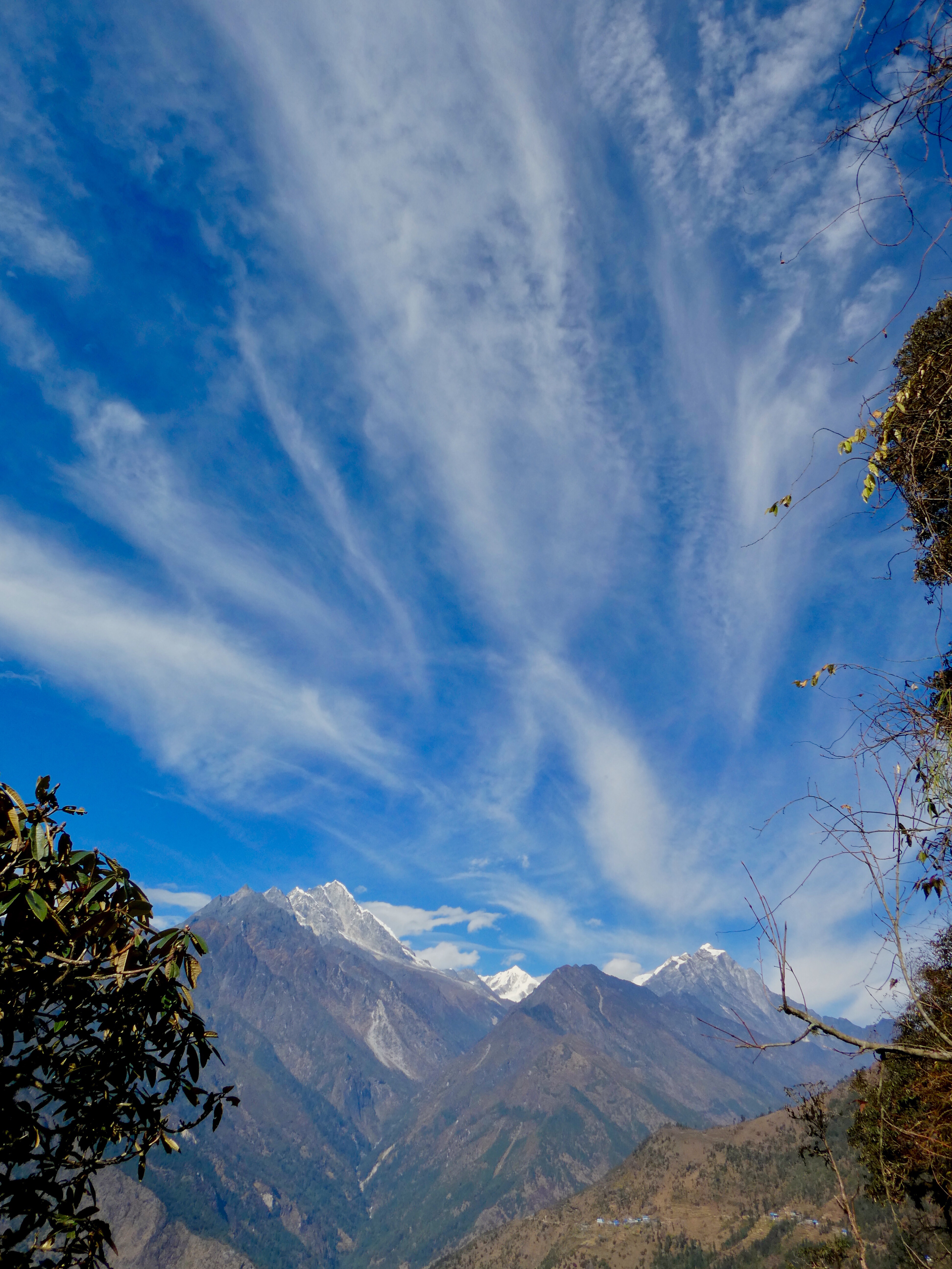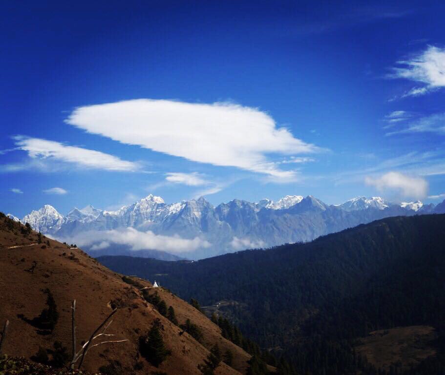 There is something really special about approaching a destination from a great distance, and nothing is quite as priceless as that first glimpse of the ceiling of Planet Earth as we rounded the bend in Phurteng on day five into our journey. A sharp array of white covered, jagged peaks, the tallest and most striking that either of us had ever seen before, suddenly pierced the blue sky ahead of us,