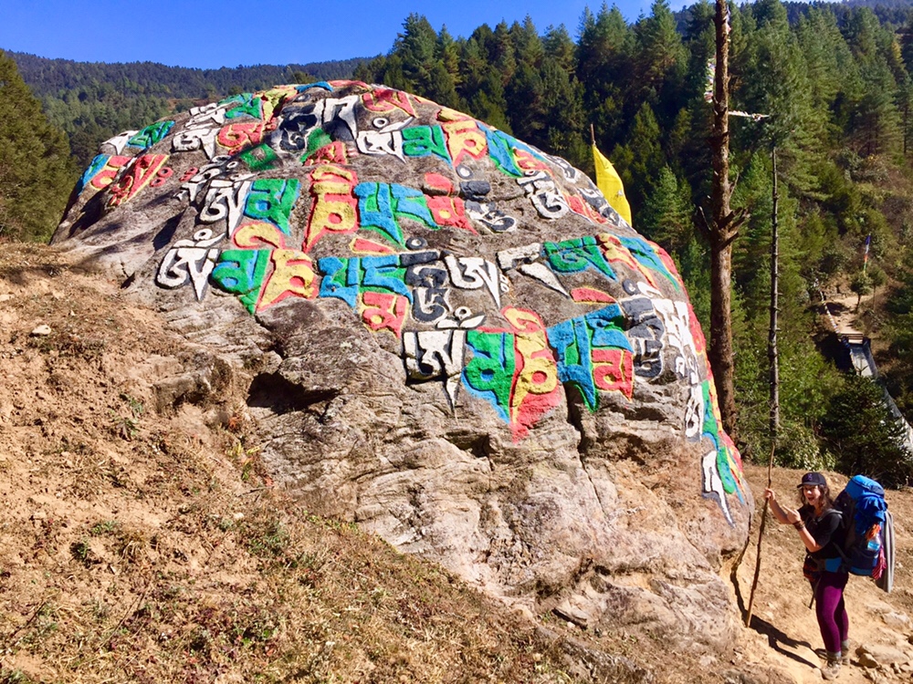 A trek through a dense green forest would be pleasantly interrupted by rainbow painted boulders illustrating prayers in Tibetan characters.