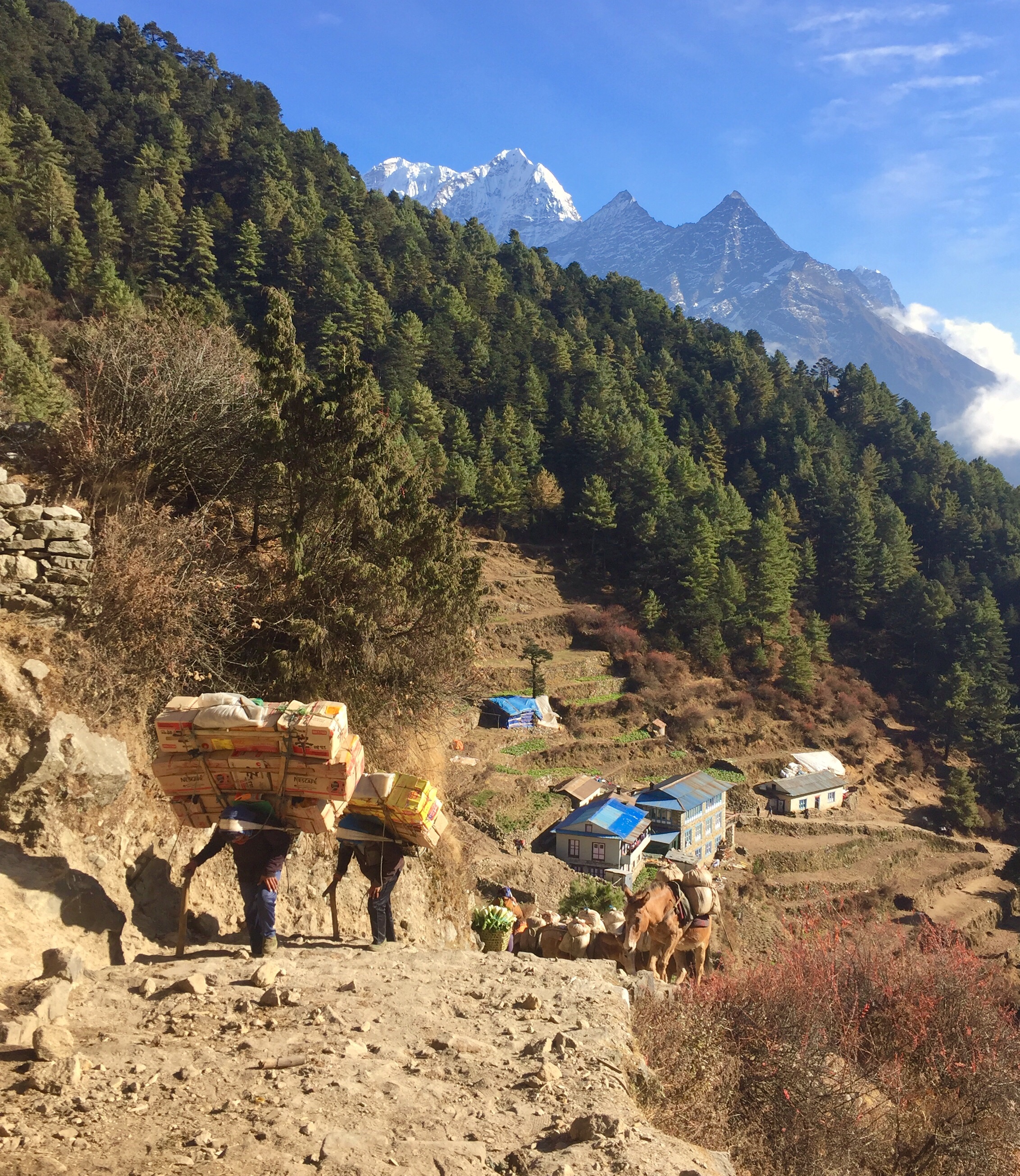 Some people might say that lugging a backpack up and down repeatedly over a number of days is self-punishment, and if I were not an experienced backpacker I might be inclined to agree with those people. The physical demand which we voluntarily took upon ourselves with our journey into the highest region of the world is not something that most people in this day and age, even the occasional backpacker, would voluntarily pursue. Our backpacks were very heavy….well, maybe not quite as heavy as these guys: