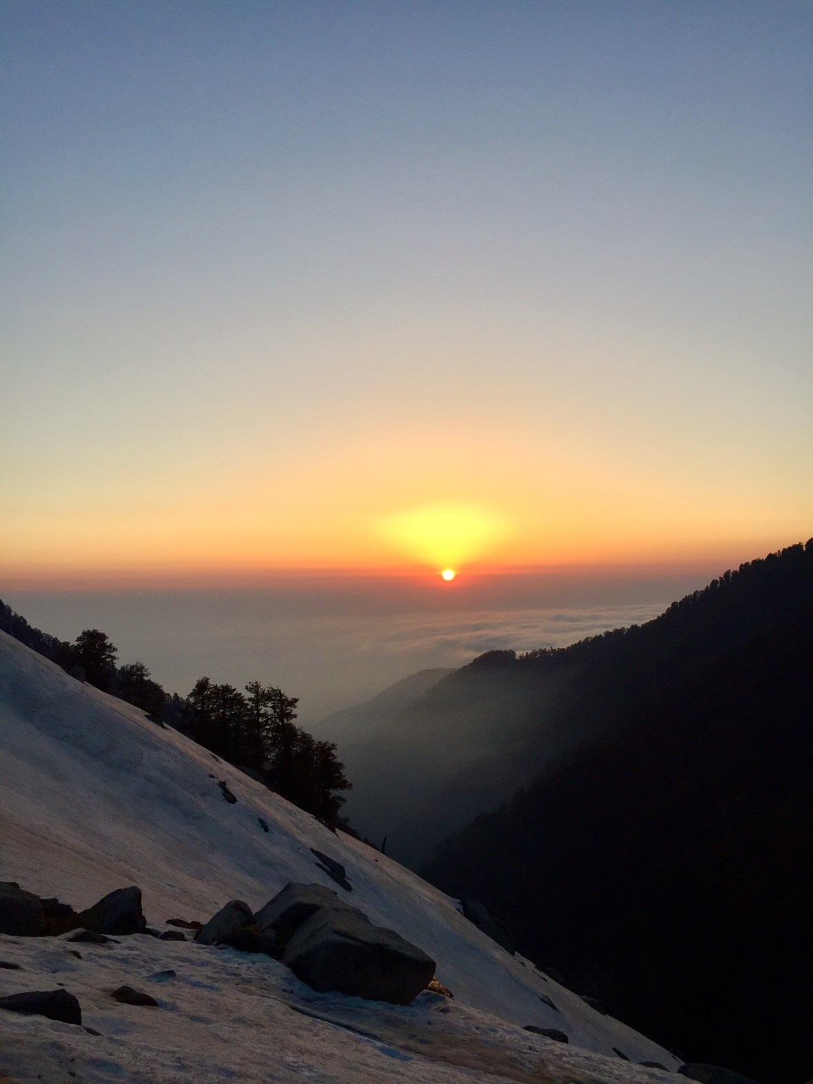 With our bellies momentarily full, we continue our ascent, eventually coming to the saddle point (and popular stopping point for most weary travelers), known as Triund. By this time, the sky is full of clouds, and looking out to what should otherwise be a stunning landscape above surrounded by snow-capped mountains, we see nothing other than a thick gray mist.