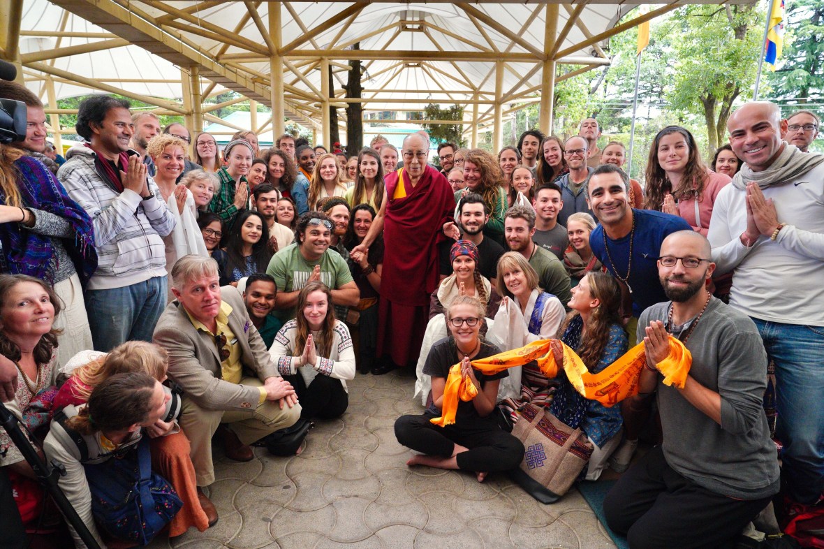 to the town of McLeod Ganj, weaving through the crowded streets and finally arriving at the doors to the Dalai Lama’s temple. Upon entering the premises, after a thorough security search, we were guided to a seating area under a large white tent where we realized that our eagerness was not large enough to get us there in time to get a good seat. We were early and the place was already packed, crawling with foreigners from all over the country trying to get the same twenty seats just in front of where the Dalai Lama would be seated. After a few moments of refusing to sit down in our distant seats with a diagonal view, an announcement was suddenly made requesting all attendees to organize themselves by which country they were from so that the Dalai Lama could make his rounds to each organized group to take an intimate photo with the excited travelers.
