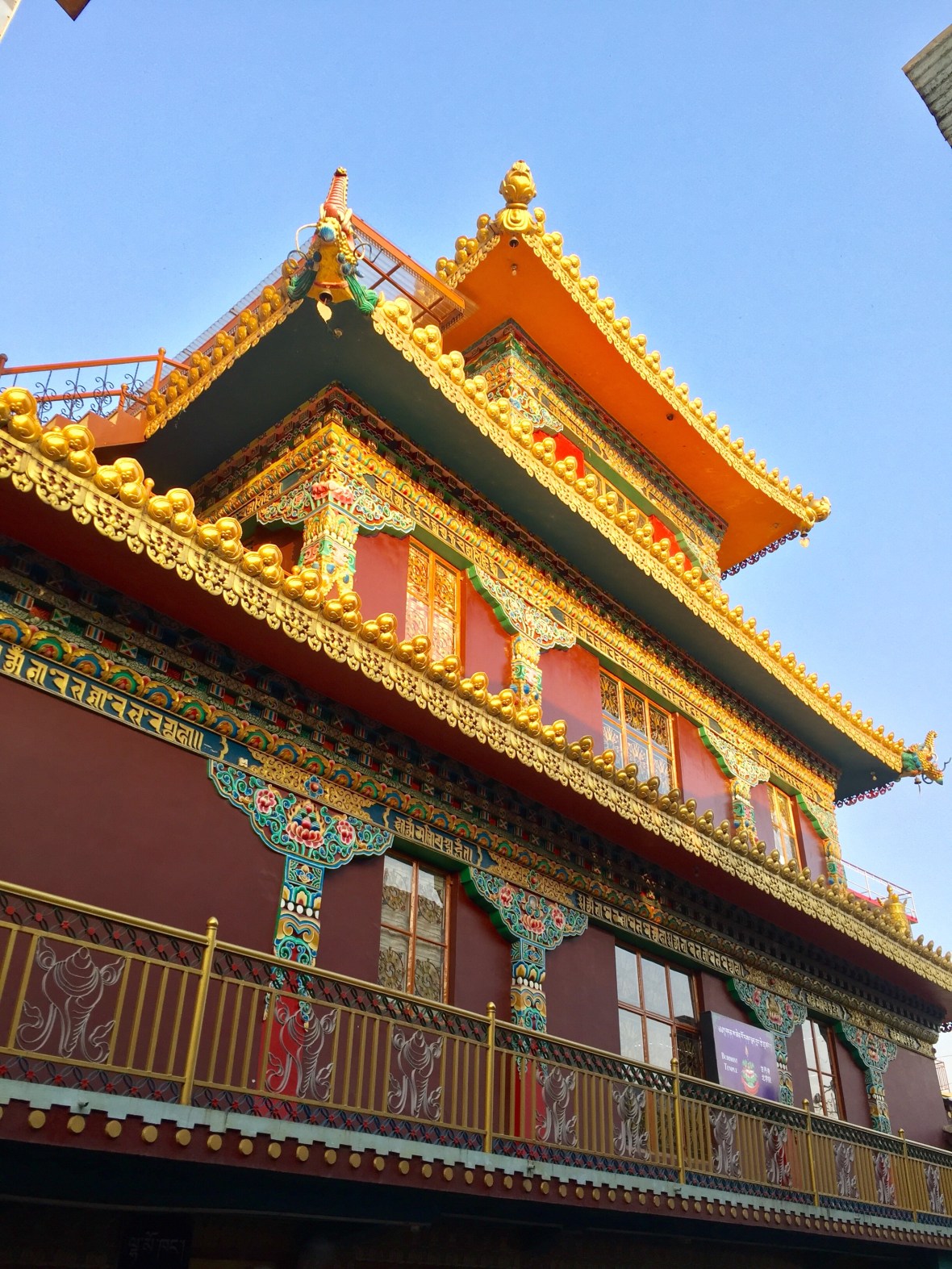 just outside of the ornately carved Tibetan Buddhist Temple.